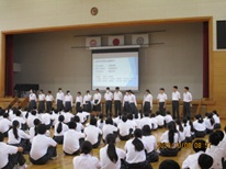 その後、体育祭に向けての発表を行いました。体育祭実行委員さんが、皆が楽しく体育祭ができるためのルールなどを説明し、「怪我無く本番を迎えられるように」との生徒会長の言葉もありました。涼しくなってきたので練習も思い切りできます。