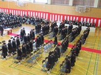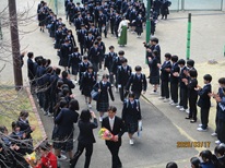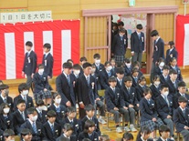 大原中学校の枝垂れ桜が数輪咲き始めた今日の良き日に、第79回卒業式を行うことができました。3年間、保護者や地域の皆様に支えられ、全員が進路を決めて新しい道に進んでいきます。在校生も気持ちを込めて式に参加し、最後の見送りを行うことができました。