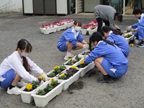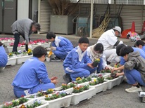 昨日の放課後、環境美化委員の皆さんが新しい花をプランターに植えてくれました。花が元気に育つように根元に土を入れ、できたプランターは昇降口に続く通路に飾りました。