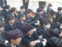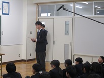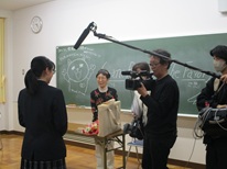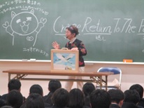 イラストレーターのことなさん(にゃおざねの制作者)のおばさまである、グランマ穎子さんが英語の紙芝居を読み聞かせてくださいました。前回は1年生が聞かせていただきましたが、英語の文法が3年生向きということもあり、今回は3年生が聞きました。NHKの取材も入り、生徒は緊張しながらも楽しんで聞いていました。